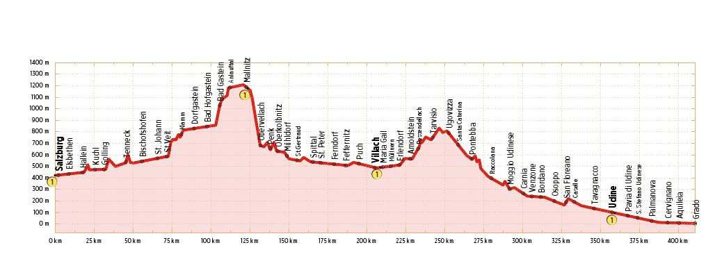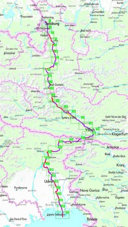 Túracélpontok: Aquileia, Bad Gastein, Bischofshofen, Cervignano, Gemona, Grado, Hallein, Mallnitz, Osoppo, Palmanova, Pontebba, Spittal an der Drau, Tarvis, Udine, Ugovizza, Venzone, Villach