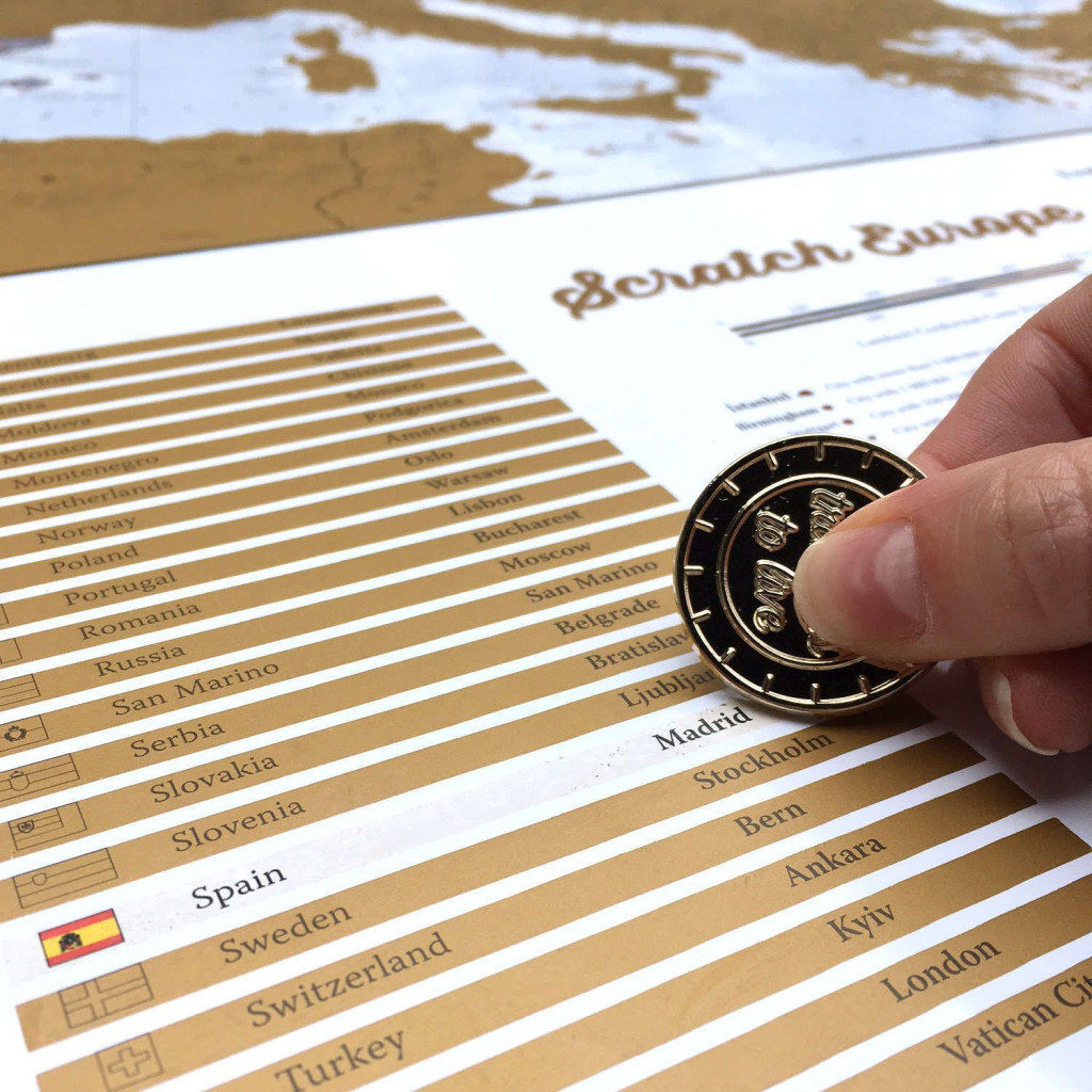 Tökéletes ajándék az utazás szerelmeseinek, akik teljesen személyre szabhatják a térképet, hogy elmesélhessék egyedi utazási történetüket. Csak fogj egy érmét, és kezdd el lekaparni az összes olyan úti célt, amelyet szerencséd volt meglátogatni, így létrehozva saját, személyre szabott és folyamatosan változó Európa-térképedet. Az országok mellett a térkép felső rétegén városok, alatta pedig Európa-térkép is látható, így részletesebben is lekaparhatod őket.