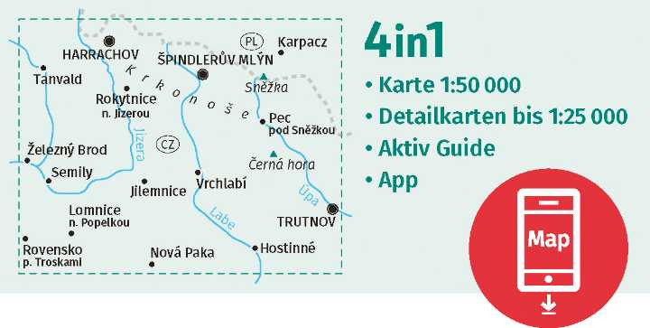 4 az 1-ben túratérkép 1:50 000 méretarányú turistatérkép, aktív útmutatóval és részletes térképekkel, beleértve a KOMPASS alkalmazásban, offline használatra is alkalmas térképet. A térkép a kerékpáros túrázáshoz és a sítúra megszervezéséhez is alkalmas.