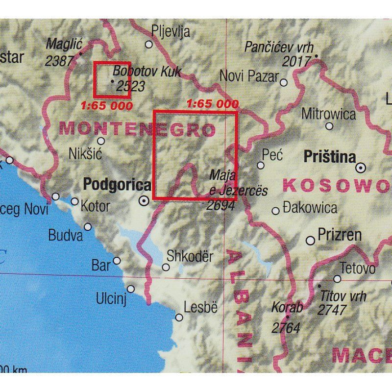 A térkép a Prokletije-hegységet, valamint a Durmitor, Bjelasica és Komovi hegységeket fedi le.
