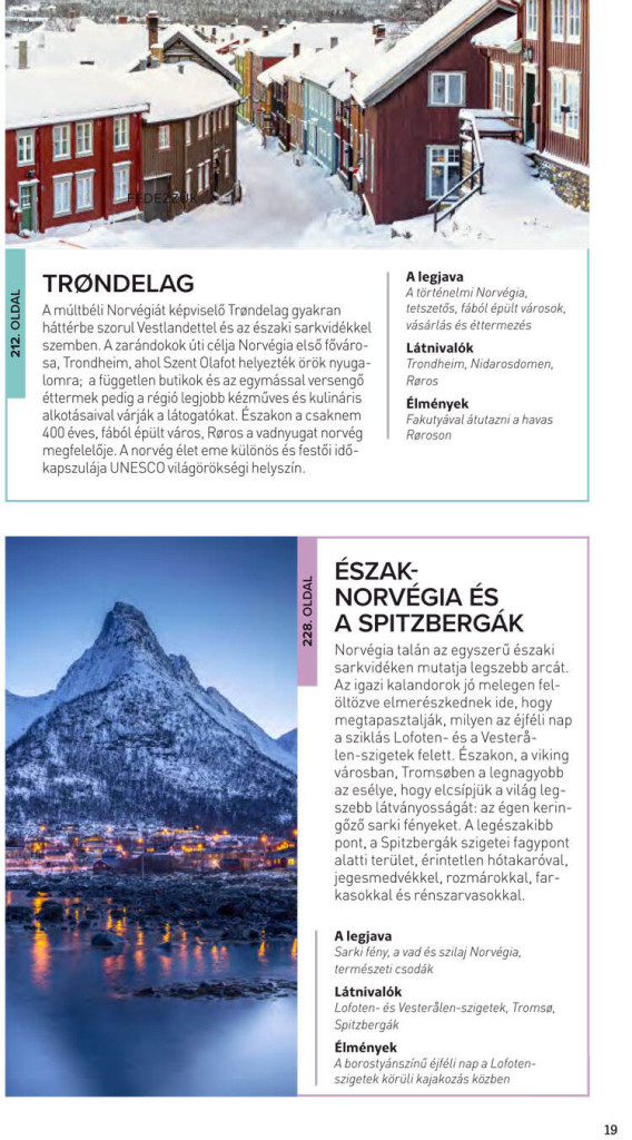 Útikalauzunk Norvégiát 7 régióra osztotta: Oslo, melyet külön fejezetben mutatunk be, Oslo-fjord környéke, Kelet-Norvégia, Sørlandet és Telemark, Vestlandet, Trøndelag, Észak-Norvégia és a Spitzbergák.