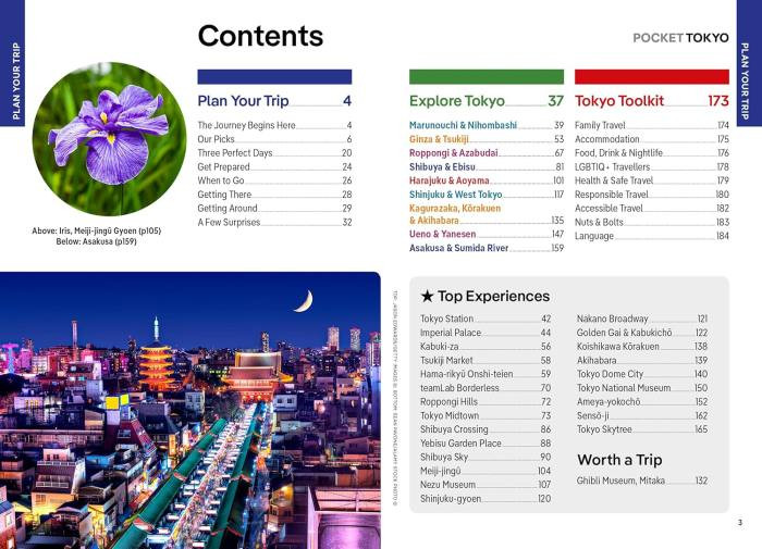 Bemutatja: A következő dokumentumokat tartalmazza: Marunouchi és Nihombashi, Ginza és Tsukiji; Roppongi és Azabudai; Shibuya és Ebisu; Harajuku és Aoyama; Shinjuku és Nyugat-Tokió; Kagurazaka, Kōrakuen és Akihabara; Ueno és Yanesen; Asakusa és a Sumida folyó, valamint egynapos kirándulás a Ghibli Múzeumba Mitakában.