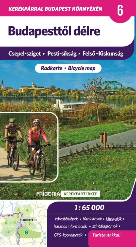 Az új, hajtogatós kerékpáros térkép a Budapesttől délre, délkeletre eső nagyobb területet ábrázolja 1:65 000-es léptékben, többnyelvű jelmagyarázattal, hátoldalán rövid túraleírásokkal, szintdiagramokkal, látnivalók felsorolásával és hasznos tudnivalókkal. Sorozatcím: Kerékpárral Budapest környékén.